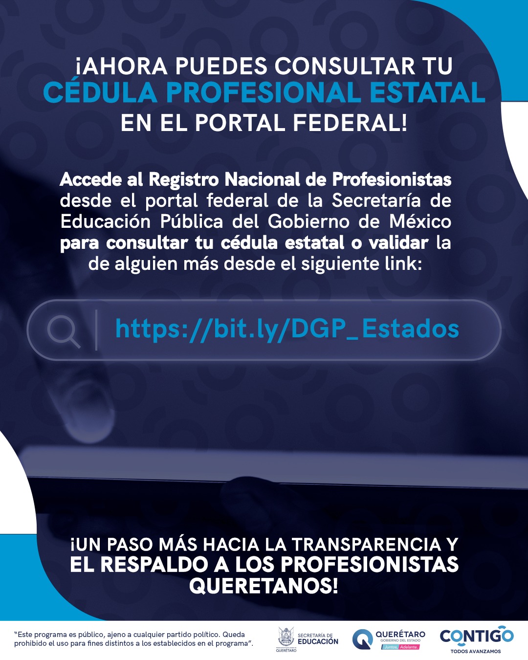 “Para la Dirección Estatal de Profesiones es muy importante regular esto que hoy estamos haciendo por primera vez en el Estado y que, reiteramos, está de vanguardia para que las instituciones educativas, tanto públicas como privadas, puedan también ver el proceso de a quiénes contratan en las diferentes áreas del sector educativo, así como también para el sector empresarial o industrial. Hoy podemos decir que Querétaro brinda certeza jurídica y certidumbre a quienes tramitan su Cédula Profesional y se abre un gran abanico informativo a través de las tecnologías de la información para en beneficio de los usuarios”, destacó.